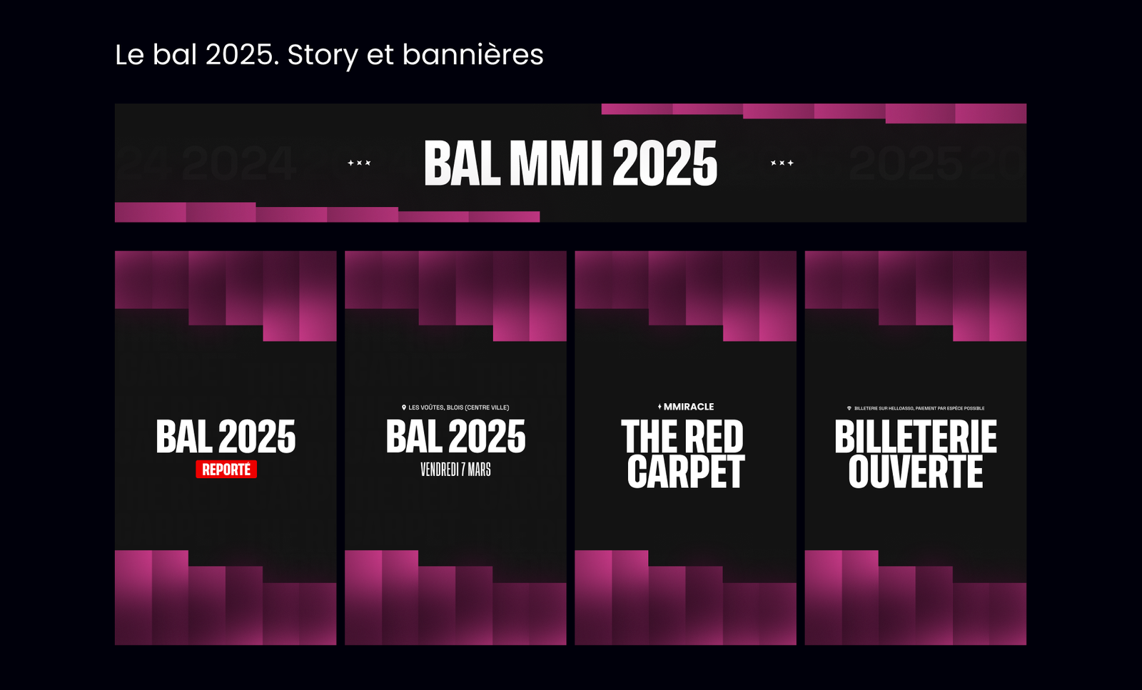 Modularité Visuelle : Mise en place d’un système graphique basé sur des bandes de couleurs dégradées et des grilles de construction. Cette structure permet de décliner l’identité sur des supports variés : cartes d’adhérents (MMI ACCESS), bannières de réseaux sociaux, et visuels d’événements spécifiques comme le BAL MMI 2025.
