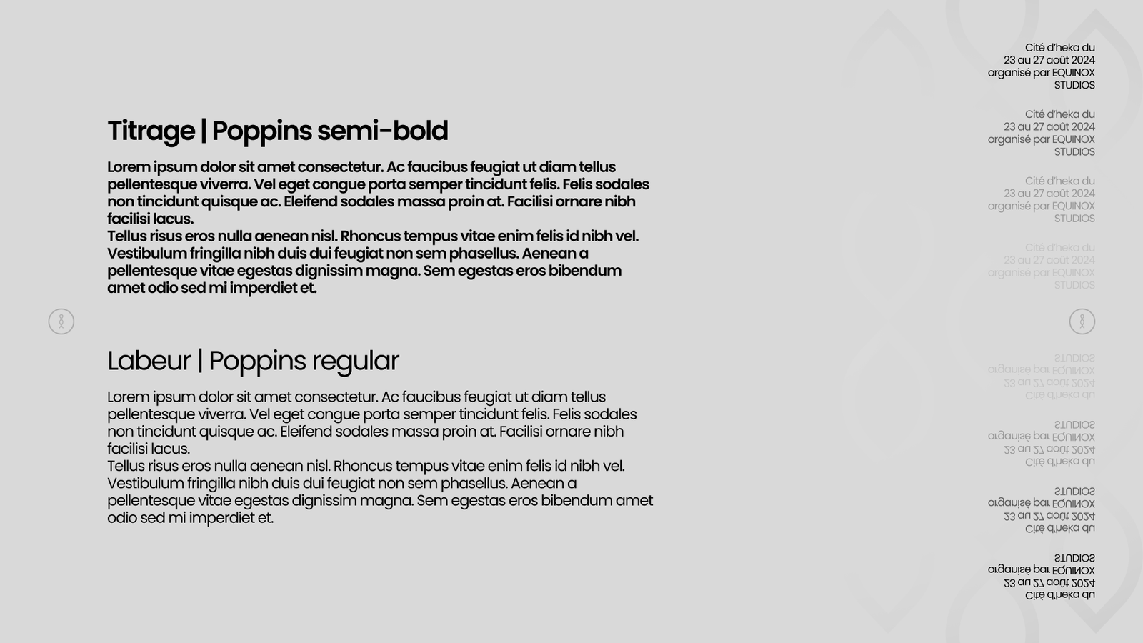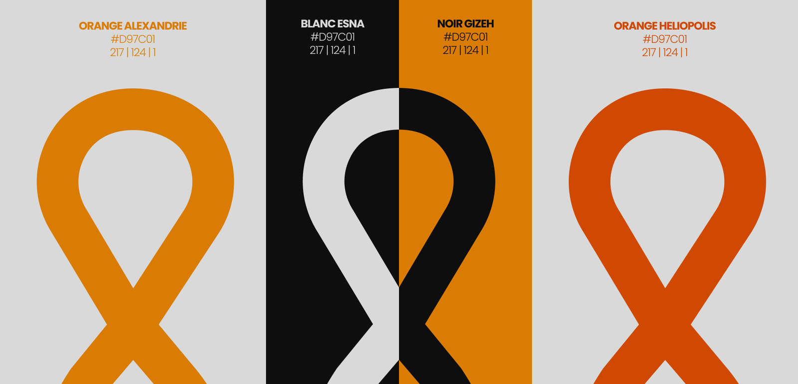 Système Visuel & UI : Conception d’une charte graphique « Solar Gradient » utilisant des nuances d’orange terreux (Orange Alexandrie, Héliopolis) contrastées par un noir profond (Noir Gizeh). Utilisation de la typographie Poppins pour assurer une lisibilité optimale sur les interfaces de quêtes, les wikis et les plannings d’événements.