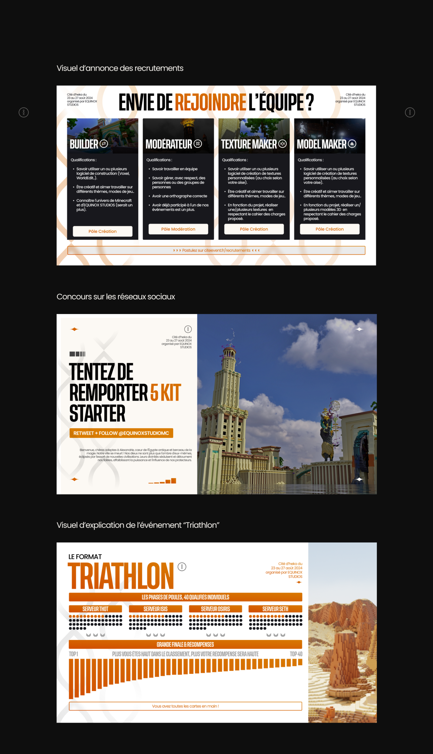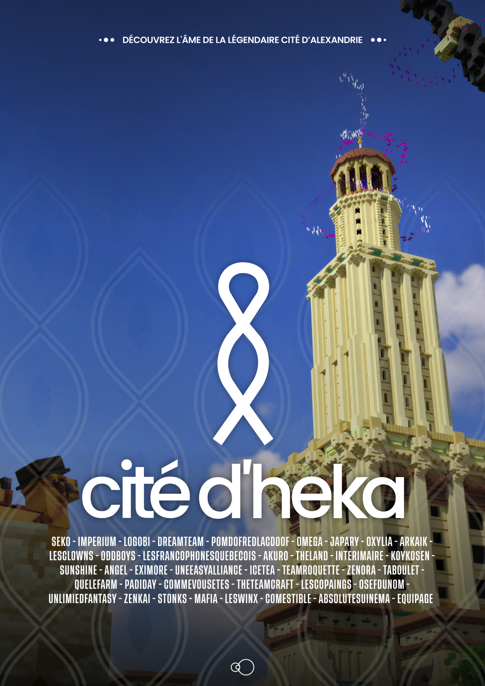 CITÉ D’HEKA est une expérience immersive de 5 jours sur Minecraft, mêlant compétition et RPG. En tant que co-fondateur, Admin et lead graphiste, j’ai piloté l’intégralité de la stratégie visuelle et de la communication pour cet événement qui a rassemblé plus de 200 joueurs simultanés dans l’univers mystique de la cité d’Alexandrie.