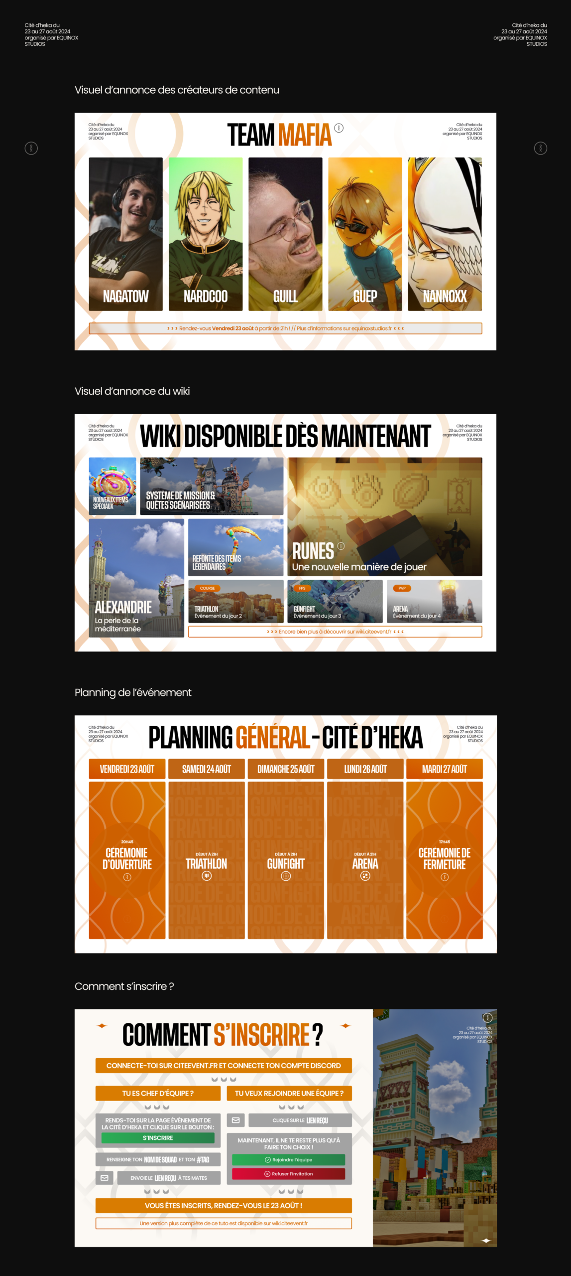 Communication & Social Media : Création d’un écosystème complet d’assets pour les réseaux sociaux : visuels d’annonce des créateurs, fiches techniques du « Triathlon », tutoriels d’inscription et plannings dynamiques. L’objectif était de rendre l’information accessible tout en maintenant une immersion totale dans l’univers de la cité.