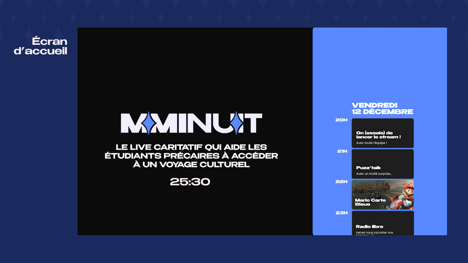 MMINUIT est un live caritatif de 48h sur Twitch organisé par les étudiants MMI. L’objectif : récolter des fonds pour financer le voyage culturel d’étudiants en situation de précarité.