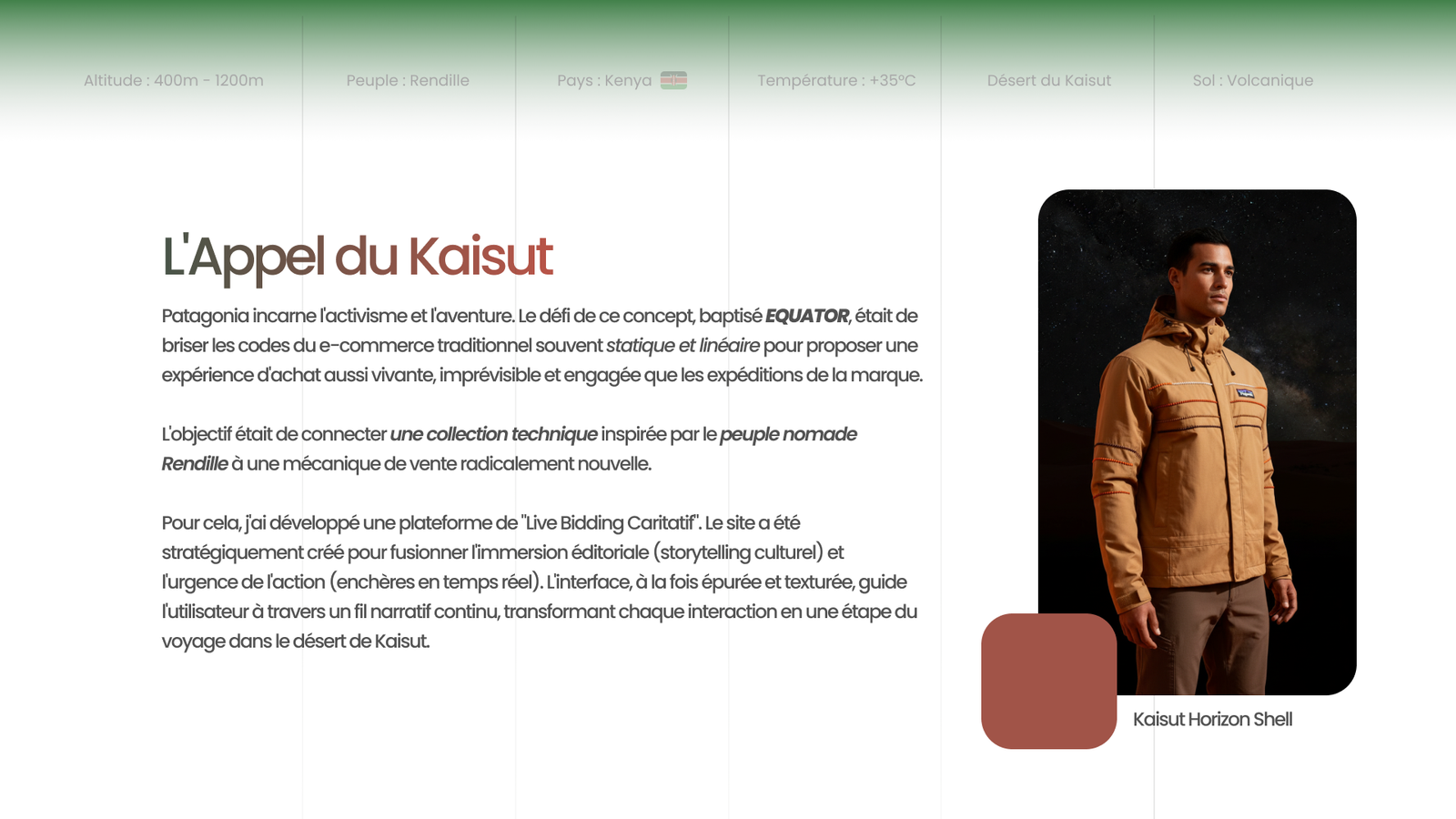 EQUATOR est un concept de plateforme e-commerce disruptive imaginé pour Patagonia (Projet fictif, réalisé dans le cadre universitaire). Le projet fusionne une collection technique inspirée par le peuple nomade Rendille (Kenya) avec une mécanique de vente radicale: le « Live Bidding » (enchères en temps réel) au profit de l’association Save the Children.