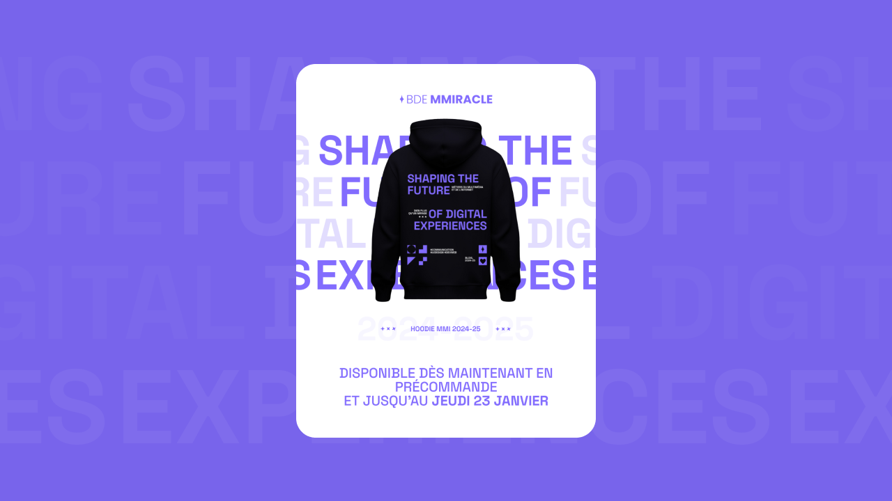 Dans le cadre de mon mandat au sein du BDE MMIRACLE, j’ai été chargé de concevoir le hoodie officiel de la promotion. L’objectif était de créer un vêtement que les étudiants porteraient avec fierté, affirmant l’identité des métiers du multimédia et de l’Internet.