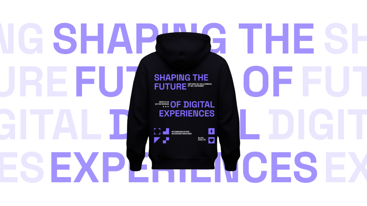 - Concept de « Brand Statements » : Utilisation de typographies imposantes et de slogans forts (« Shaping the Future of Digital Experiences ») pour transformer le hoodie en un manifeste (et rendre MMI à la mode !).